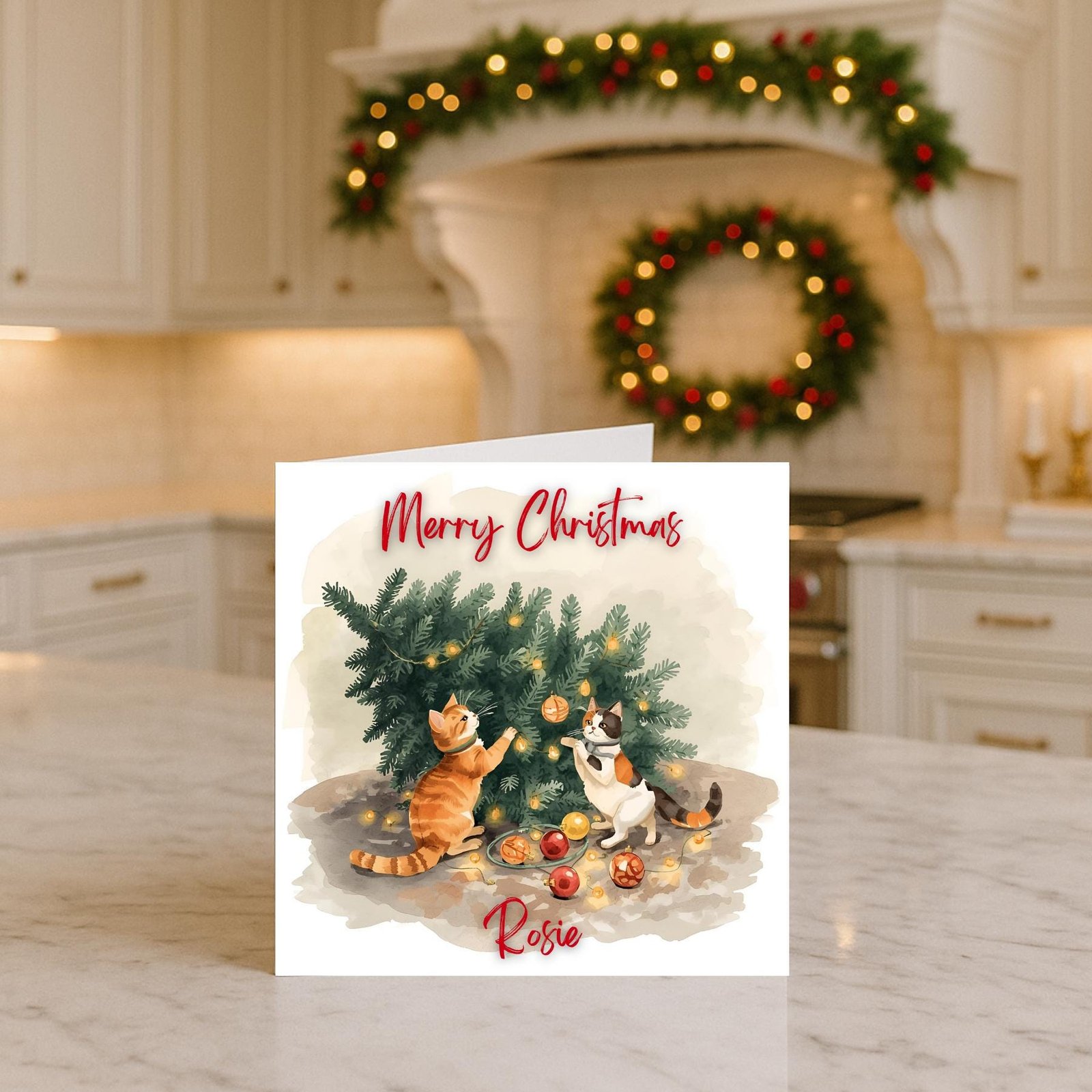 This Christmas card captures a cozy and humorous moment, two curious kittens turning the holiday tree into their favorite playground. With ornaments scattered and tiny paws in full action, the scene brings a warm, joyful spirit that is perfect for anyone who loves cats. Each card is professionally printed to achieve vivid colors and crisp detail, ensuring your gift feels personal, thoughtful and full of festive charm. Add the custom name to create a memorable keepsake for the holiday season.