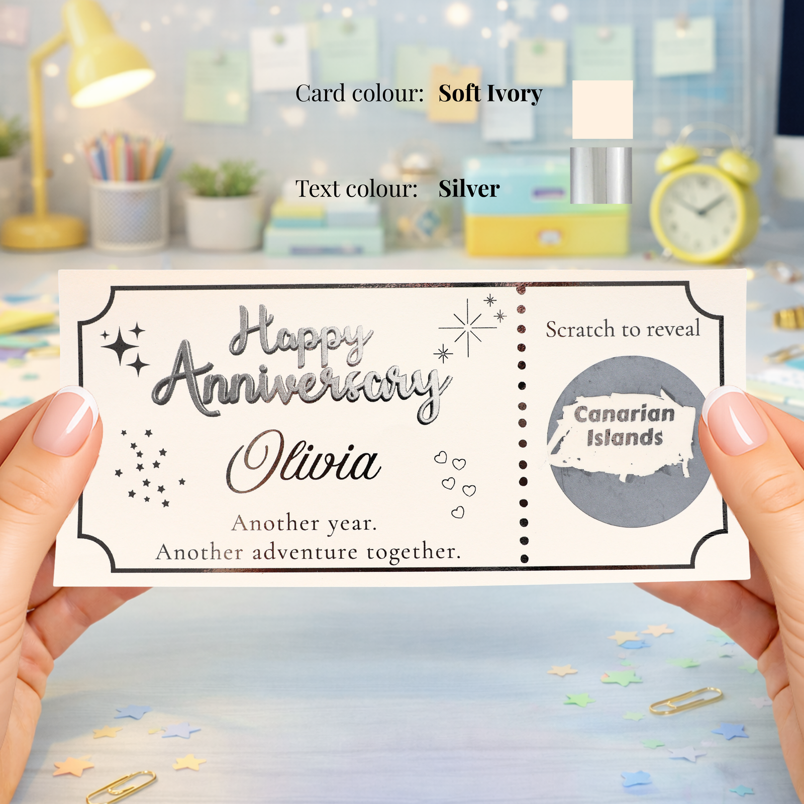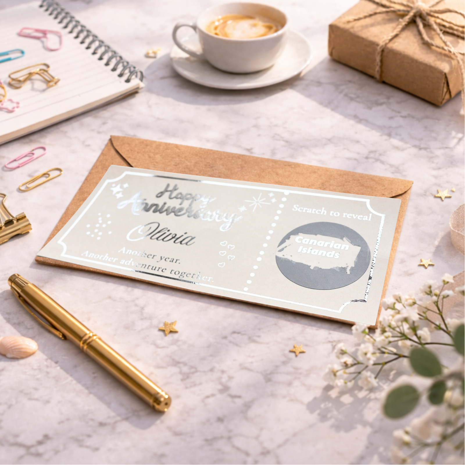 Personalised Anniversary Holiday Reveal Scratch Card Canary Islands Trip Surprise Gift Voucher for Couple