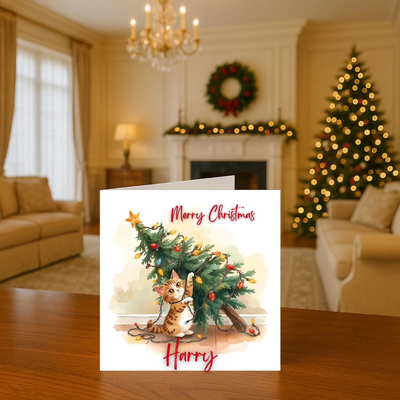 Personalised Cat Christmas Card With Festive Tree Scene, Pet Holiday Greeting, Custom Name Gift For Cat Lovers, Warm Seasonal Design