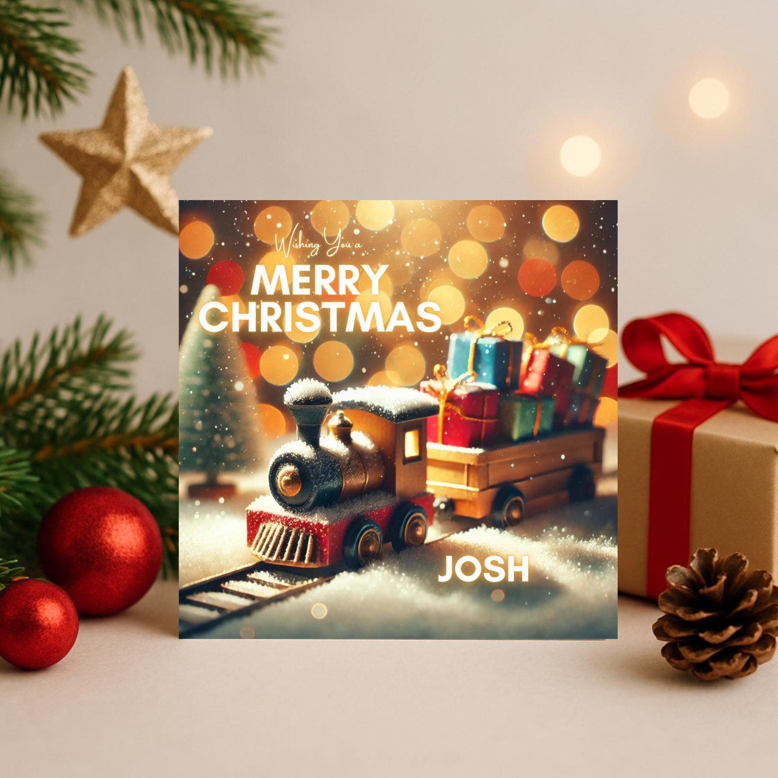 🎄 Personalised Christmas Train Card – Festive Locomotive with Gifts – Professionally Printed Holiday Greeting with Name