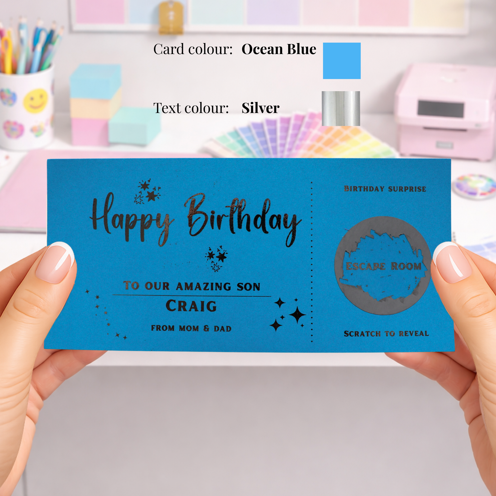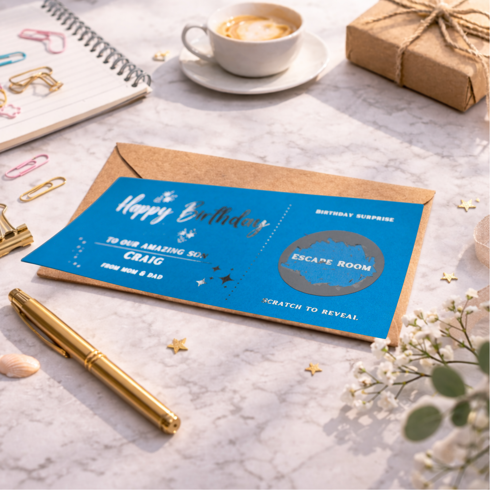 • Personalised Birthday Scratch Card Escape Room Gift Reveal, Custom Surprise Experience Voucher for Son or Teen Birthday