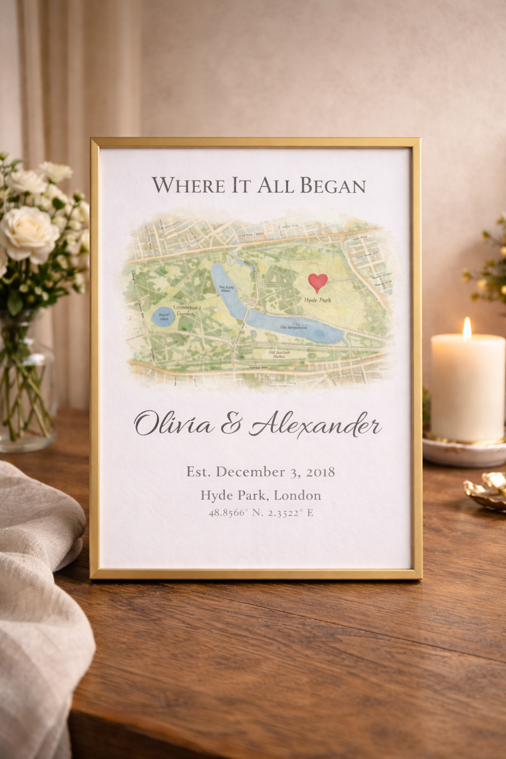 Perfect as a romantic keepsake, anniversary surprise, or Valentine’s Day gift, this map captures a moment, a place, and a memory, all in one refined design.