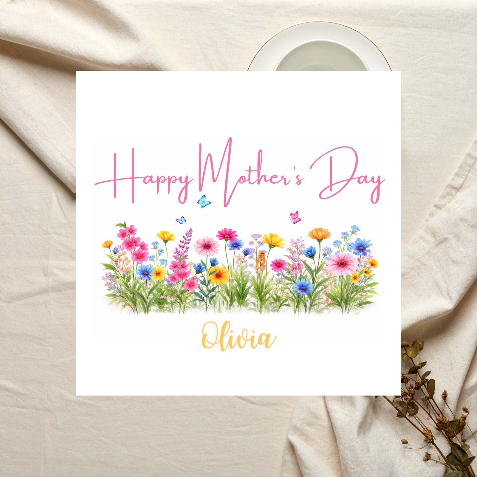 Be the first to review “Personalised Mother’s Day Card with Wildflower Meadow and Butterflies, Custom Happy Mothers Day Gift for Mum, Bright Spring Floral Design”