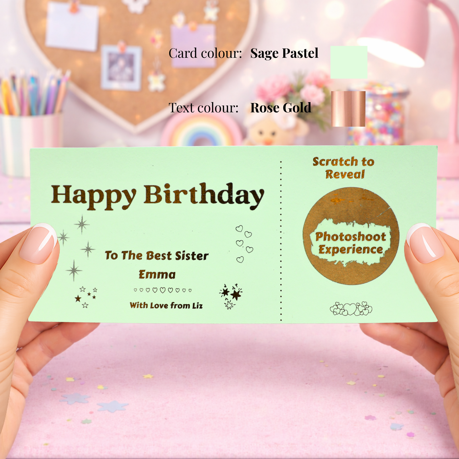 Personalised Birthday Scratch Card Photoshoot Experience Reveal, Custom Surprise Photography Gift Voucher for Sister Friend