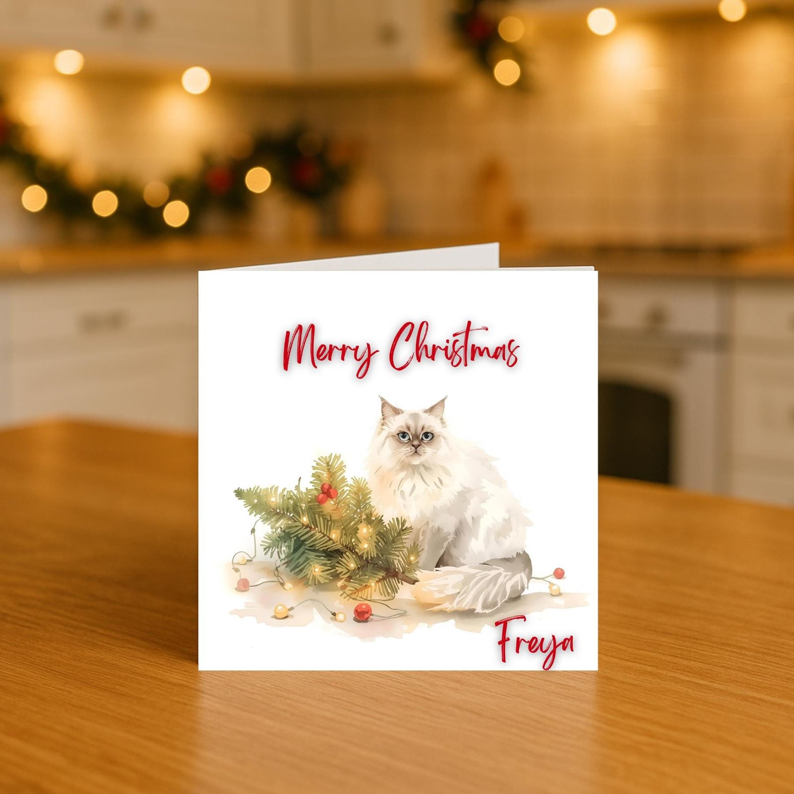 This charming illustration captures a fluffy cat sitting gracefully beside a glowing pine branch decorated with warm holiday lights and delicate ornaments. The artwork creates a peaceful and cozy festive moment, making it a perfect gift for pet lovers and anyone who enjoys heartfelt seasonal designs. Each card is professionally printed to ensure vivid color, crisp detail and a premium finish, so your gesture arrives beautifully. Add the custom name to transform this winter scene into a truly meaningful keepsake.
