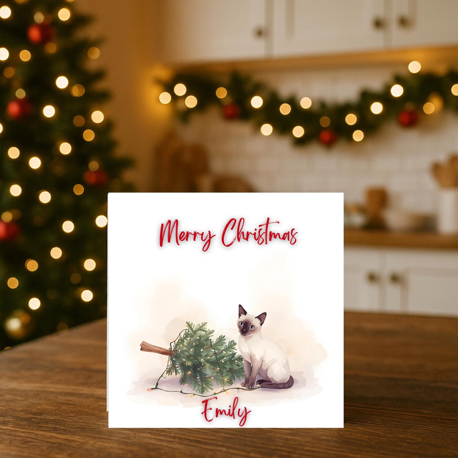 This delicate winter illustration features a graceful Siamese cat sitting beside a fallen pine branch wrapped in soft holiday lights, creating a calm and charming seasonal moment. The artwork blends elegance, warmth and a touch of playful mischief, making it a perfect gift for pet lovers and anyone who appreciates thoughtful holiday designs. Every card is professionally printed to ensure vivid color, crisp detail and a premium finish, so your gesture feels meaningful and truly special. Personalize it with a name to turn this peaceful scene into a cherished winter keepsake.