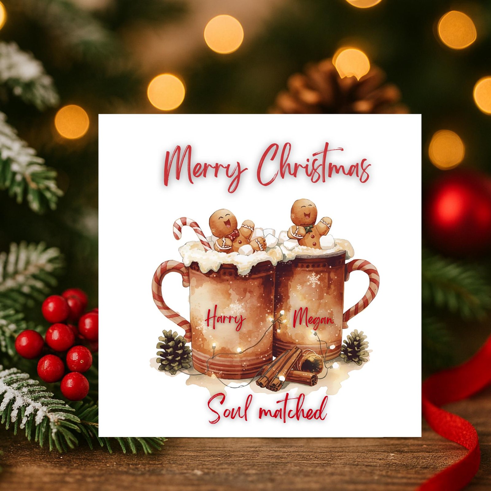This professionally printed design brings a warm touch of Christmas magic to your holiday season. Two glowing gingerbread mugs, sprinkled with cinnamon, candy canes, and soft festive lights, create a heartfelt scene perfect for couples. Your chosen names make it even more personal, turning this card into a meaningful keepsake your loved one will treasure.
